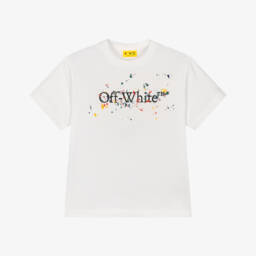 Boys white logo T-shirt by Off-White is crafted from soft cotton jersey. Featuring the distinctive Off Stamp logo in pink on the front and the iconic oversized arrows logo on the back, this piece stands out. Ideal for casual wear, it offers comfort and style. Limited quantities available, don't miss your last chance to buy.
