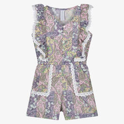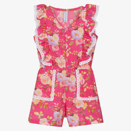 The pink floral ruffle jumpsuit for girls by Olga Valentine showcases a delightful floral design on soft, lightweight cotton. This charming piece features elegant ruffles and delicate white crochet lace trims, offering both style and comfort. The elasticated waist ensures a snug fit, while button fastenings and convenient front pockets add practicality. Perfect for springtime adventures, this jumpsuit is a limited edition, making it a last chance to buy.