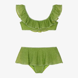 Chic purple frilled bikini set for girls by Oséree, crafted from stretchy, quick-drying lumière fabric with a stunning glitter sparkle for a signature look. Both pieces feature a comfortable silky lining and feminine frilled trims. Perfect for a day by the pool or beach, this bikini ensures both style and comfort. Limited quantities available – last chance to buy this exclusive piece.