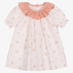 Exclusive to Childrensalon, a pretty white dress for baby girls by Paloma de la O, made in soft, lightweight cotton. This cute dress has a pretty orange and green floral pattern and short sleeves with elasticated cuffs. It has a coordinating dark orange ruffle collar and there are button fastenings on the back. It comes with matching orange knickers for a complete look.