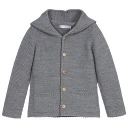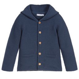 A dark yellow knitted jacket for little boys and girls by Paloma de la O. Made in beautifully soft, mid-weight acrylic with a cute pointed hood, it is warm and comfortable. There are wooden buttons and little patch pockets on the front.