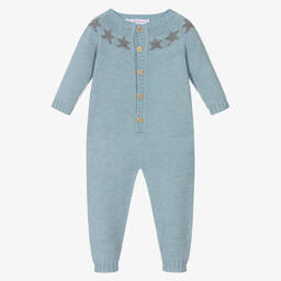 Cute grey knitted babygrow for boys and girls, by Paloma de la O. Made in a super soft wool blend, it has sweet intarsia black stars and easily fastening natural beige wooden buttons on the front.