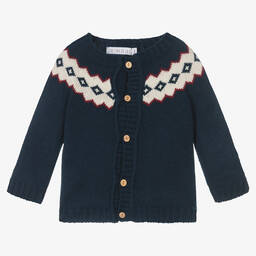 Soft dark red knitted Fair Isle style cardigan by Paloma de la O. Suitable for boys and girls, it fastens down the front with little wooden buttons for a traditional look.