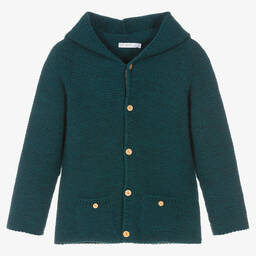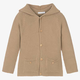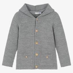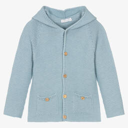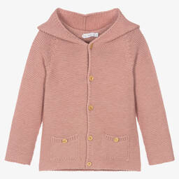 Lovely burgundy red knitted cardigan for boys and girls, by Paloma de la O. Crafted in super soft acrylic, it has natural wooden button fastenings on the front for easy dressing, and small ribbed hand pockets.