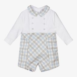 Boys ivory and beige linen shortie by Patachou is ideal for special occasions. Traditionally styled, it features an ivory linen shirt and beige twill shorts with decorative buttons and smart pin-tuck detailing. The blue striped bow tie attaches with buttons, completing the charming look. Fastens neatly at the back with buttons and has convenient poppers between the legs. Limited quantities available, so don't miss out on this elegant piece.