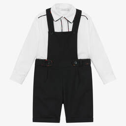 Boys blue, beige and white striped shorts set from Patachou, made in a soft cotton and linen blend. The white shirt has an attached, lined waistcoat and both have front button fastening. The striped Bermuda shorts have an adjustable waistband on larger sizes and two front pockets. They fasten with a zip and button on the front.