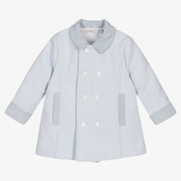 Younger boys traditional grey coat by Patachou, made in soft flannel. The collar, sleeve cuffs and pockets are made from grey corduroy. It has a classic double breasted style with branded button fastenings, and an ivory satin lining.