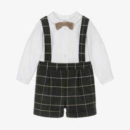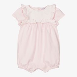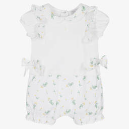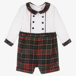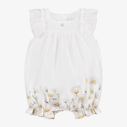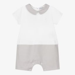 Ivory and navy stripe shortie for baby boys by Patachou offers a touch of summer charm. Crafted with a soft jersey cotton top accented with navy piping and decorative buttons, it features a striped, linen-blend lower section with faux pockets. The shortie ensures ease with back buttons and poppers between the legs. Designed for spring and summer, this item is ideal for warm days, promising both style and comfort. Limited quantities available, don't miss out.