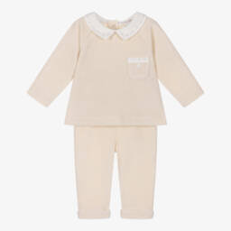 The boys knitted grey trouser set by Patachou is crafted from a soft blend of merino wool and cashmere. Featuring a charming intarsia sheep design, the long-sleeved top fastens with buttons at the back for ease. Paired with matching grey trousers, this set offers both warmth and style for little ones. Limited quantities available, making it a great choice for cosy autumn and winter days.