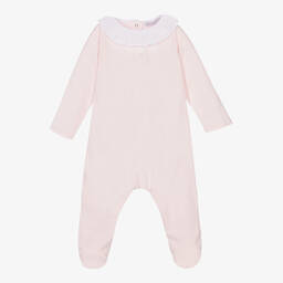 A white babygrow for boys by Patachou features a soft cotton jersey construction for ultimate comfort. The smart, blue striped woven collar adds a hint of sophistication, complemented by matching striped trims. Practical popper fastenings ensure easy dressing, and the patch pocket with tonal logo embroidery delivers a designer touch. Perfect for keeping little ones cosy, this piece is available in limited quantities, making it a must-have addition to any spring or summer wardrobe.
