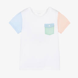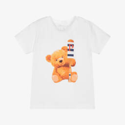 Boys white sailing teddy T-shirt by Patachou, made from soft cotton jersey for superior comfort. It features an adorable sailing teddy bear graphic with the brand's initial 'P' on the flag, adding a charming touch. Perfect for casual wear, this T-shirt is both stylish and comfortable, ideal for everyday adventures. Limited quantities available, so act fast to secure this delightful piece.