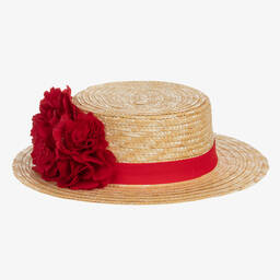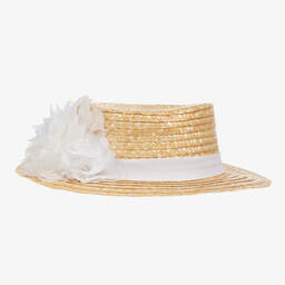 Beige boater-style straw hat for girls by Patachou. It has a wide brim and a pink band with a gorgeous chiffon and tulle flower decoration on one side.