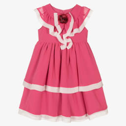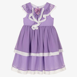 Pale blue dress for girls from Portuguese brand Patachou, made in lightweight chiffon. There is a white-trimmed ruffle on the bodice with a 3D flower appliqué for a pretty touch. The skirt is lightly gathered, with white-trimmed tiers creating a lovely shape that moves freely. It is fully lined with lightweight cotton for added comfort, and a concealed zip fastening on the back gives a neat finish.