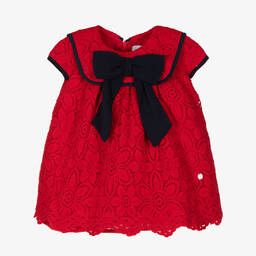 Navy blue dress for little girls by Portuguese brand Patachou, made in beautifully soft cotton lace. It has a bib collar with deep red trims and a chiffon bow appliqué for a romantic, classical look. For comfort, it is lined in layers of soft and lightweight cotton. There is a pearlescent charm logo on the front, and a concealed zip fastening on the back.