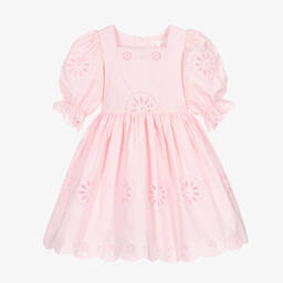 Girls blue embroidered cotton dress by Patachou, exclusive to Childrensalon, features a square neckline, balloon sleeves, and a full hemline with beautiful cutwork embroidery and scalloped edges. Crafted from softly woven cotton, it includes a fixed tie that creates a charming bow at the back, complemented by a concealed zip fastening. Perfect for special occasions or summer outings, this dress is available in limited quantities, so it is the last chance to buy.
