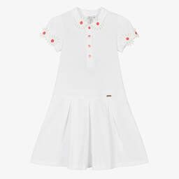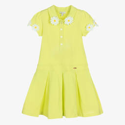 In a Childrensalon exclusive, girls can channel tennis style in this lovely lime green polo dress from Patachou. Stitched on the collar and capped sleeves are sweet white fabric flowers with yellow embroidered centres, complementing the pearlescent front buttons for a coordinated look. This sports-luxe look is made in soft and stretchy cotton piqué, with an on-trend dropped waist and box-pleated skirt. The brand's rose gold logo plate is stitched on the waist to finish the design.
