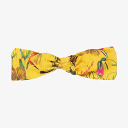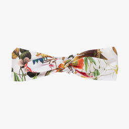 Gorgeous dark pink cotton headband for girls by luxury brand Patachou, with a colourful floral print. Made in soft poplin, it has an attached bow on the top and an elasticated panel around the back for a secure fit.