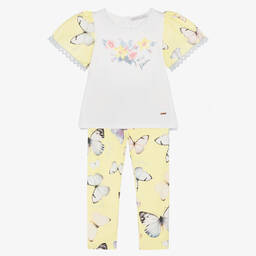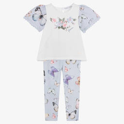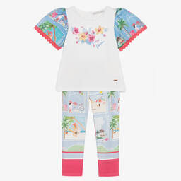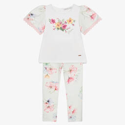 Exclusive to Childrensalon, a pretty white and pink leggings set for girls by Patachou. With a lovely cross stitch flower design on the front, the T-shirt has a white jersey body with split side vents and a rose gold logo tab sewn above the hem. The poplin sleeves gently gather on the shoulder for a feminine look. With pretty pink cotton lace trims, the sleeves are patterned in a contrast botanical floral print which is made to match the stretchy, full-length leggings.