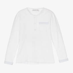 Exclusive to Childrensalon a white long-sleeved top for girls by Patachou, made in soft and stretchy brushed cotton jersey. Warm and cosy, it has a navy blue and red tartan collar and panel on the front with frilled edging and gold button trims. This pretty top has puffed sleeves and popper fastenings on the back.