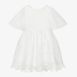 Ivory, beige and pink tweed dress for girls by Patachou, with sparkly gold sequins. This gentle A-line style has an ivory crêpe chiffon ruffle collar with bow detail and matching sleeves with elasticated ruffle cuffs. Lined in lightweight cotton, it fastens with a concealed zip on the back.