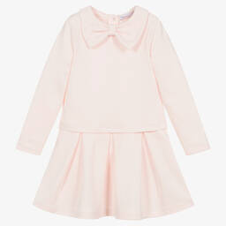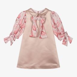 Ivory, beige and pink tweed dress for girls by Patachou, with sparkly gold sequins. This gentle A-line style has an ivory crêpe chiffon ruffle collar with bow detail and matching sleeves with elasticated ruffle cuffs. Lined in lightweight cotton, it fastens with a concealed zip on the back.