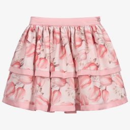 Pale pink skirt for girls by Patachou, exclusive to Childrensalon. Made in tiers of chiffon trimmed in satin, it has a lovely poppy print in contrasting deep pink. The adjustable waistband has a diamanté button fastening. The lining has a tulle frill for extra volume.