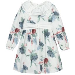 Exclusive to Childrensalon, a younger girls pink dress from Patachou, with a floral pattern in different shades of pink. It is made in soft chiffon, with a lightweight cotton lining that has tulle trim for extra volume. There is a pale pink ruffle collar, with a fixed sash belt that ties in a bow on the back. A logo charm is attached to the waist and it fastens with a zip on the back.