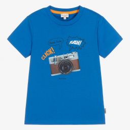 Orange T-shirt for boys by Paul Smith Junior, made in soft organic cotton jersey. It has a blue and silver camera motif on the front, trimmed with the brand's signature multicolour stripes.