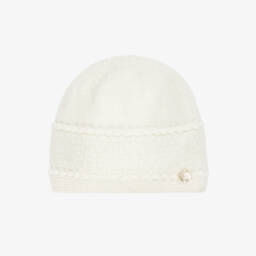This charming beige hat for baby girls by PAZ Rodríguez is knitted in a soft cotton and cashmere blend. It features a delicate openwork pattern with a scalloped brim and a mother-of-pearl button embellishment. The hat has tie straps for a secure fit, making it both practical and stylish.