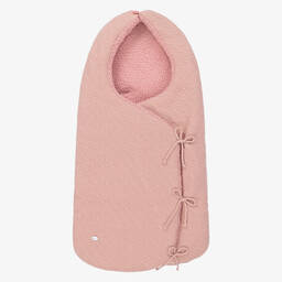 Baby girls and boys blue knitted nest by Paz Rodriguez. It is softly padded and has a cosy teddy fleece lining. There are tie fastenings on the front and a zip fastening along the bottom, allowing it to be opened up flat. The slits on the back can be cut open for safety straps to be threaded through in a buggy or car seat.