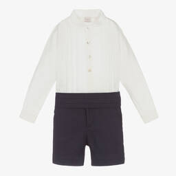 Smart white and turquoise blue linen shorts set for boys by Paz Rodriguez. The white collarless shirt has a half button fastening and pin tucks down the front. It comes with turquoise blue linen shorts and a matching cummerbund. The shorts have a useful adjustable waist fasten with a zip and button for ease.