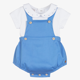 Little boys two-piece dungaree shorts set from Paz Rodriguez. The white top is made in a soft cotton jersey and fastens with poppers on the back. It has green embroidered dots on the Peter Pan collar. The cotton twill dungaree shorts have an elasticated waistband and button fastening straps. They are fully lined in lightweight cotton and have button fastenings between the legs.