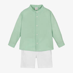 Smart ivory and blue shirt and shorts set for boys by Paz Rodriguez, made in a soft and lightweight cotton linen blend. The ivory collarless shirt has a half button fastening and pin tucks on the front. The blue woven shorts have an adjustable waist, three pockets and fasten with a zip and button. The set also comes a matching blue cummerbund that fastens with two buttons.