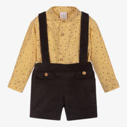 Smart ivory and blue shirt and shorts set for boys by Paz Rodriguez, made in a soft and lightweight cotton linen blend. The ivory collarless shirt has a half button fastening and pin tucks on the front. The blue woven shorts have an adjustable waist, three pockets and fasten with a zip and button. The set also comes a matching blue cummerbund that fastens with two buttons.