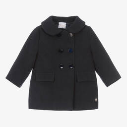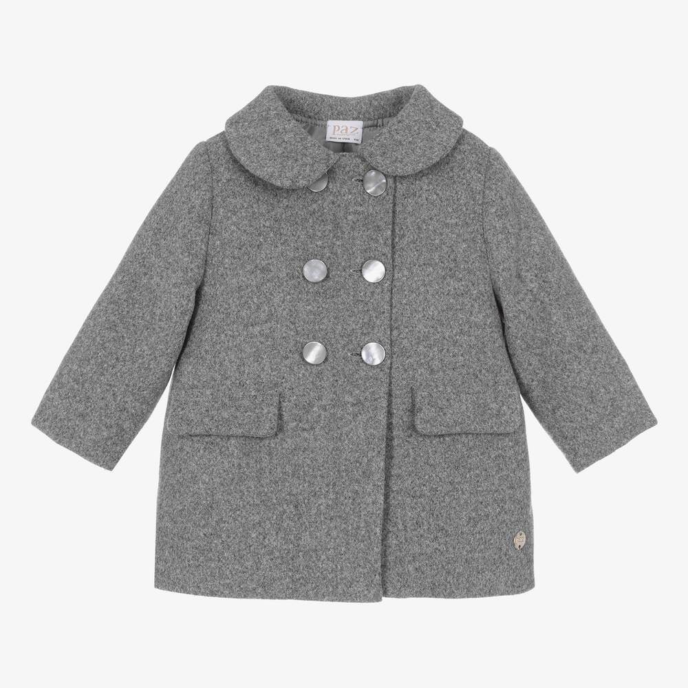 A lovely grey coat for little girls by Spanish brand Paz Rodriguez, with a soft felted feel and a silky satin lining. This classic and timeless design has a collared neckline and fastens with grey, iridescent buttons. There are faux flap pockets on the front and a silver metal logo charm on the hem. It has an inverted pleat on the back for a smart finish.