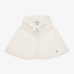 The charcoal wool blend cape for girls by Paz Rodríguez is a must-have for cooler days. Crafted from a soft knit, it features charming wooden buttons on the sides creating armholes. The detachable faux fur-trimmed hood adds warmth and style, while the faux drawstring at the neckline offers a casual touch. A silver logo charm near the hemline completes the look. Limited quantities available, so don't miss your chance to add this elegant piece to your collection.