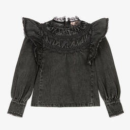Blue denim blouse for girls by Australian brand Petite Amalie, with a light, washed finish. Styled with a traditional look, it has ruffle trims on the shoulders and cotton lace trims on the collar. Coordinating floral details can also be seen on the front and back for a lovely finishing touch. It has a concealed zip fastening on the back and button fastenings on the barrel cuffs.