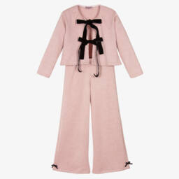 This ivory trousers set by Phi Clothing is a stylish choice for girls. Made in soft tulle, both pieces are adorned with shimmering sequins and lined in cotton jersey for comfort. The top has an elasticated hem and a large black velvet bow on the front for a statement finish. The trousers have a wide-leg silhouette and a gently elasticated waist.