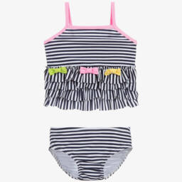 Girls blue floral bikini by Phi Clothing offers a charming look with its silky smooth and stretchy fabric. The pale blue material is adorned with a delightful pink and yellow floral print, creating a beautiful contrast. The ruched top features shoulder ties that form elegant bows, and the lined bottoms are decorated with feminine ruffle trims and side ties. Limited quantities available, making it a last chance to buy this lovely swimwear.