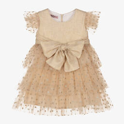 Girls pink tulle hearts dress by Phi Clothing is a delightful special occasion piece. Sweet and feminine, the layered tulle skirt and frilled short sleeves are decorated with a glittery gold heart pattern for added sparkle. The soft woven bodice matches the detachable sash belt that can be tied into a beautiful bow on the front or the back. Lined in soft cotton, it fastens with a concealed zip on the back for a neat finish. Limited quantities available.