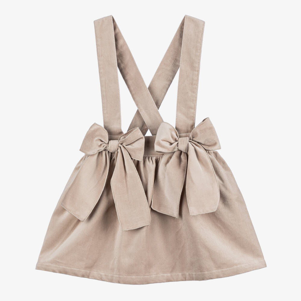The girls soft beige velour skirt by Phi Clothing is a charming choice crafted from luxurious cotton velvet. Featuring delightful bow appliqués on the waistband, this skirt offers a romantic feel. The traditional cross-over straps make dressing easy with button fastenings at the back. Suitable for autumn and winter, it's designed to sit above the knee, offering both style and comfort. Limited quantities available, so don't miss the chance to add this beautiful piece to your collection.