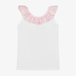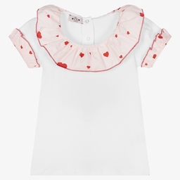 The girls white cotton frill sleeve T-shirt by Phi Clothing combines comfort and style with its soft and stretchy cotton jersey fabric. Featuring short sleeves made with layers of pink ruffled cotton poplin, this top offers a delightful girly touch. Ideal for everyday wear, it ensures easy dressing with popper fastenings on smaller sizes. Limited quantities available, so it's your last chance to buy this charming piece.
