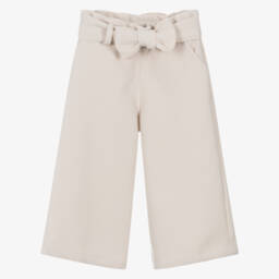 Stylish white wide-leg trousers for girls by Phi Clothing, made in mid-weight diamond-weave cotton. With an elasticated waist, they have an all-over navy blue polka dot pattern and a removable tie bow belt for a pretty look.
