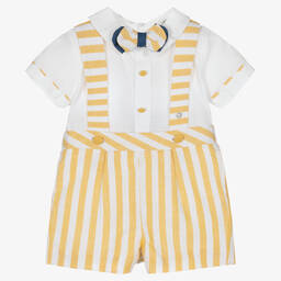 White and navy blue striped shorts set for little boys by Piccola Speranza. Made in organic cotton and fully lined, the shorts have adjustable button-fastening shoulder straps and a comfortable elasticated waistband. The smart white cotton shirt has decorative covered buttons on the front and trims to match the shorts. It fastens with poppers on the back and comes with a cute bow tie to complete the look.