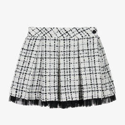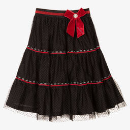 Black gingham check skirt for girls by Piccola Speranza. Smooth and lightweight, this smart pleated skirt has a black bow and spot print, with a black plumeti tulle petticoat peeping out underneath. There is a side button and zip fastening and it is fully lined for comfort.