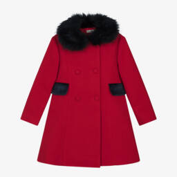 A charming Navy Blue coat for girls by Piccola Speranza offers a beautifully soft fabric with a felted finish. Designed in a classic A-line shape, it features faux front pockets, elegant red velvet-covered buttons, and a scalloped placket detail. The glamorous faux fur collar complements the floral-patterned satin lining, adding a touch of sophistication. Complete with a mother-of-pearl logo disc, this coat is both stylish and practical. Limited quantities available, lovely for those special outings.