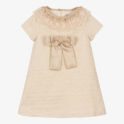 Lovely pink tweed dress for girls by Piccola Speranza, made in a soft cotton blend. It has a sparkly weave, a fixed bow on the front and a tulle collar delicately embroidered with pink flowers. It is lined with lightweight cotton and fastens with a concealed zip on the back.