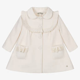 Lovely red coat for girls by Piccola Speranza. Traditionally styled, this smart coat is made in soft, felted fabric, with large box pleat trims for a stunning, timeless silhouette. Fully lined in silky magenta pink satin, it has two front patch pockets decorated with diamanté velour bows, and it fastens with buttons at the front.