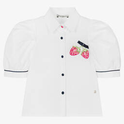 Smart white cotton poplin shirt for girls from Portuguese brand Piccola Speranza. It has a lovely green limes motif embroidered onto the front, with sparkly diamanté detail and a navy blue grosgrain ribbon. Fastening with navy blue fabric buttons, this unique design has puffed half-length sleeves for a modern look.
