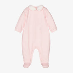 Ivory babygrow for girls by Italian brand Emporio Armani, patterned with the brand's signature Eagle logo in pink. Made in comfortable cotton jersey, it fastens with logo poppers on the back and between the legs. Ideal as a gift, it comes with a branded organza bag.